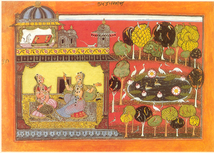 7. Lady blames cat for scratches inflicted by lover, Basohli, ca. 1660-1670.