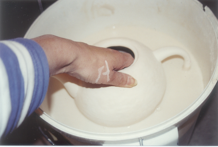 7. Tējkannu iemērc glazūras šķidrumā;